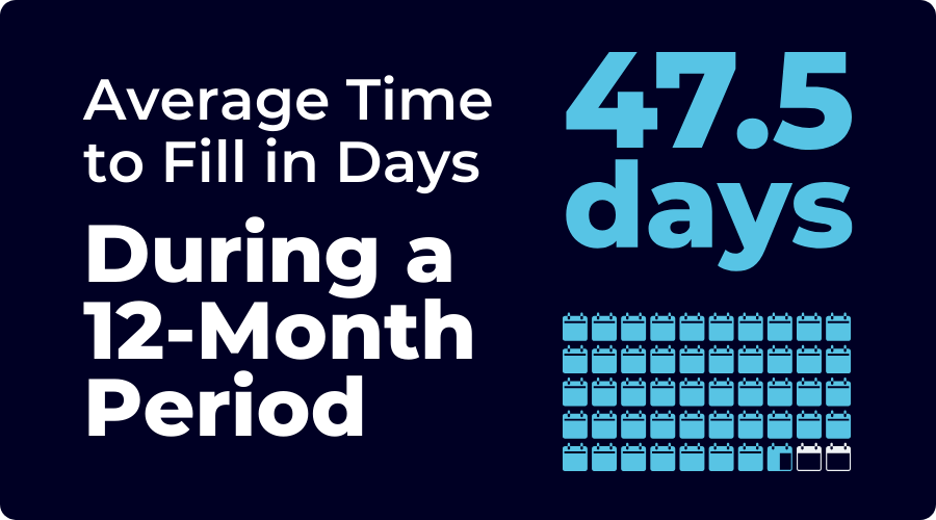 The average time to fill for companies of all sizes is 47.5 days. While time to hire for most organizations has historically hovered around 40 days, during the last 12 months, this number has been higher.