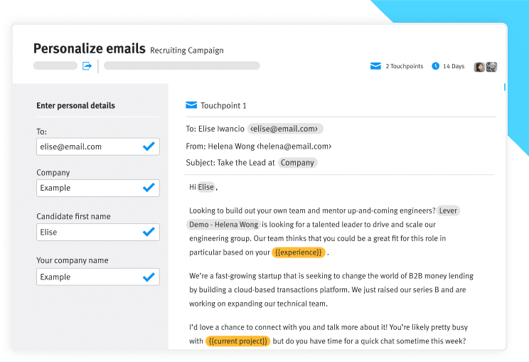 Personalize every message to show candidates how important they really are. Lever’s Advanced Nurture makes it easy to send personalized emails from hiring managers or leaders at scale so you can get the responses you’ve been looking for.